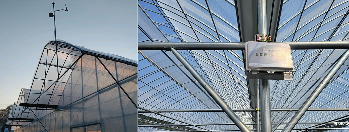 온실 지붕위로 기상대를 대기온도, 습도, 일사량센서와 풍향, 풍속 센서를 설치하여